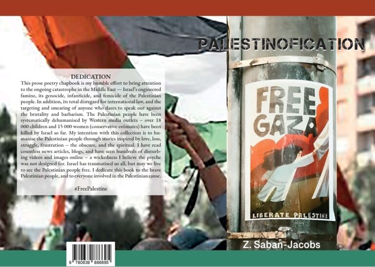 This humble chapbook is dedicated to the courageous people of Palestine. Palestinofication features ten prose poems and photographs that show the destruction of Gaza and the Palestinian people at the hands of Israeli Occupation Forces. The collection touches on Palestinian food, culture, love, and loss – the author also struggles to make sense of the dark and chaotic world in a few poems.